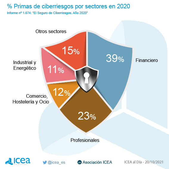 Los sectores que más primas aportaron a los seguros de ciberriesgos en 2020 fueron el Financiero y el de Profesionales, con un 62% del total y un 40% de las pólizas.
